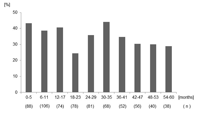 そこで、POPの特異的症状の有病率と腹腔内圧を上昇させる習慣などのリスクファクターとの関係がわかれば、産後の女性のPOP発症を予防できる可能性があると考えて調査しました。産後5年間のPOPの自覚症状の有病率を産褥期ごとに明らかにすること、さらに自覚症状のリスクファクターを明らかにすることを目的としました。都内大学病院一施設で、経腟分娩で出産した女性3776名に質問票を郵送し、1056名(28.0%)から回答を得ました。POPに関する有効回答数は681名でした。その結果、産後5年間にPOPの自覚症状があった女性は36%、産後半年以内にあった女性は43%だったのです(図2)。自覚症状しか尋ねていませんので、実際に臓器の脱出を起こしているかは不明です。ただし、症状を自覚している女性が、産後早期からこれほどいることは意外でした。そのPOP症状を有するリスクファクターは、失禁の経験があること、硬便であること、妊娠前に排便時に力む習慣があったこと、産後に硬便であることが示されました。